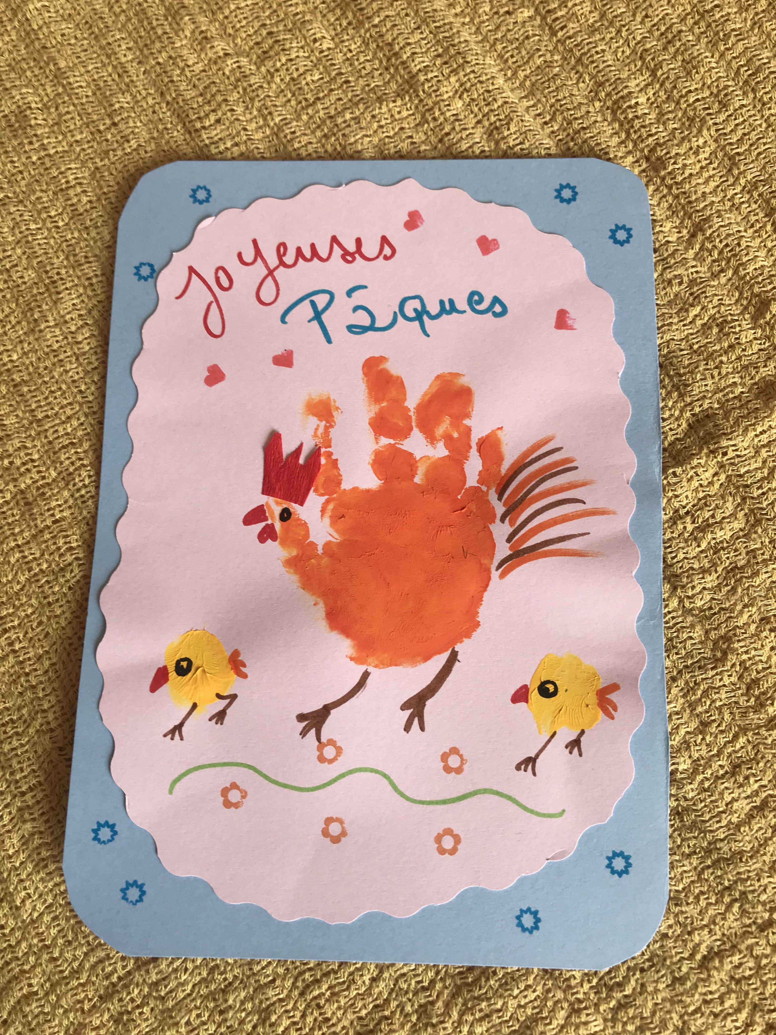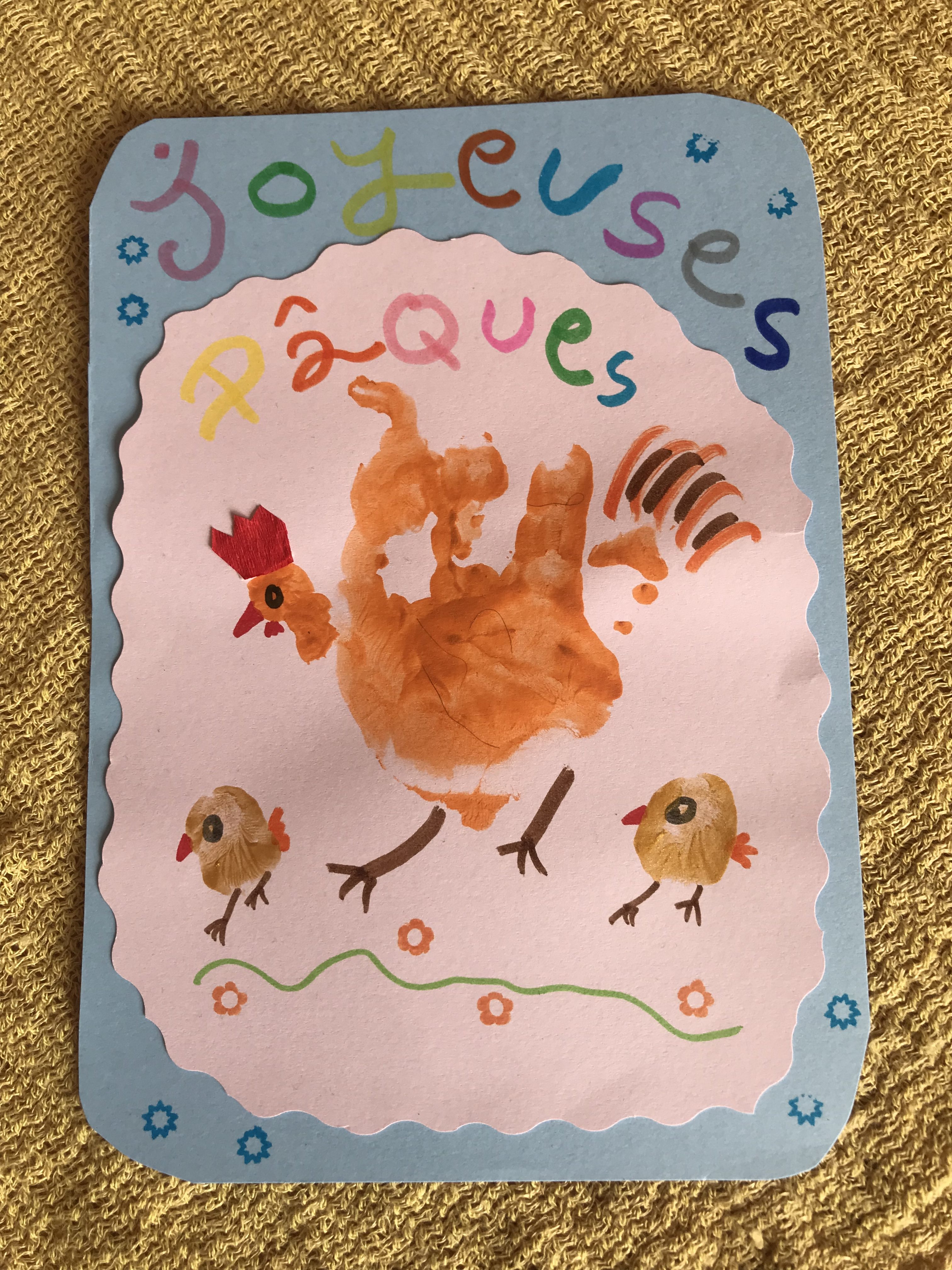 voici ce que cela donne avec une main bien mise à plat ou encore lorsque la main de l’enfant n’est pas bien à plat, cela fait une poule complètement déjantée 🙂