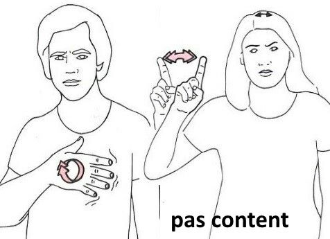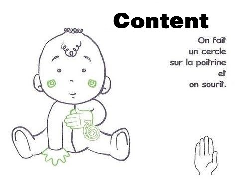 Bonjour! C’est super , mais attention pour « pas content », ça ne colle pas si vous accompagnez avec le langage parlé. L’ordre « content pas », correspond à de la LSF seule. Or si vous parlez en même temps que vous signez, il faut respecter l’ordre, et donc signer + dire d’abord « pas », puis idem pour « content » . Sinon l’enfant va associer le signe de « content » au mot oral pas », et inversement. Il faut de la congruence entre le message visuel et le message oral, sinon on s’y perd. Bonne journée 🙂