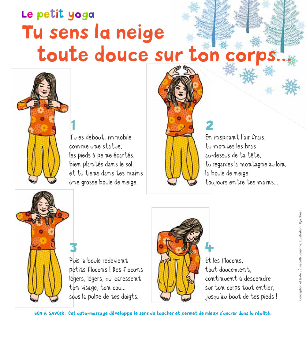 Tu sens la neige :Tu sens la neige toute douce sur ton corps un auto massage pour développer le sens du toucher et permettre de mieux s’ancrer dans la réalité.