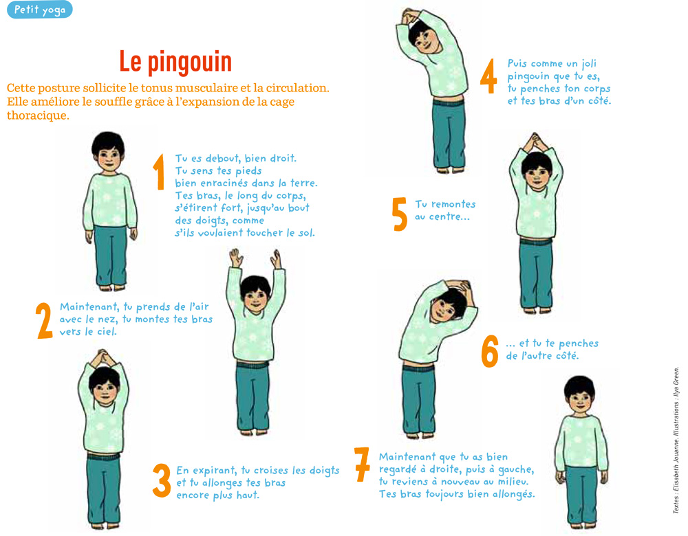 Le pingouin :Cette posture sollicite le tonus musculaire et la circulation. Elle améliore le souffle grâce à l’expiration de la cage thoracique.