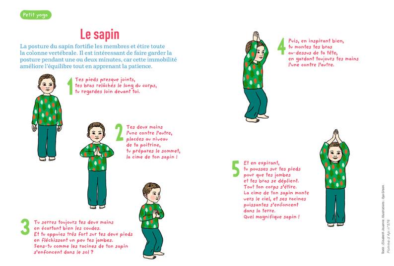 Le sapin: La posture du sapin fortifie les membres et étire toute la colonne vertébrale. IL est intéressant de faire garder la posture pendant une ou deux minutes, car cette immobilité améliore l’’équilibre tout en apprenant la patience.