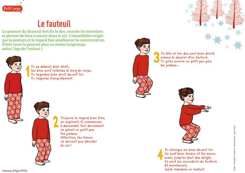 Le fauteuil:La posture du fauteuil fortifie le dos, muscle les membres et permet de bien s’ancrer dans le sol. L’immobilité exigée par la posture et le regard fixe améliorent la concentration. (Faire tenir la posture plus ou moins longtemps selon l’Age de l’enfant.)