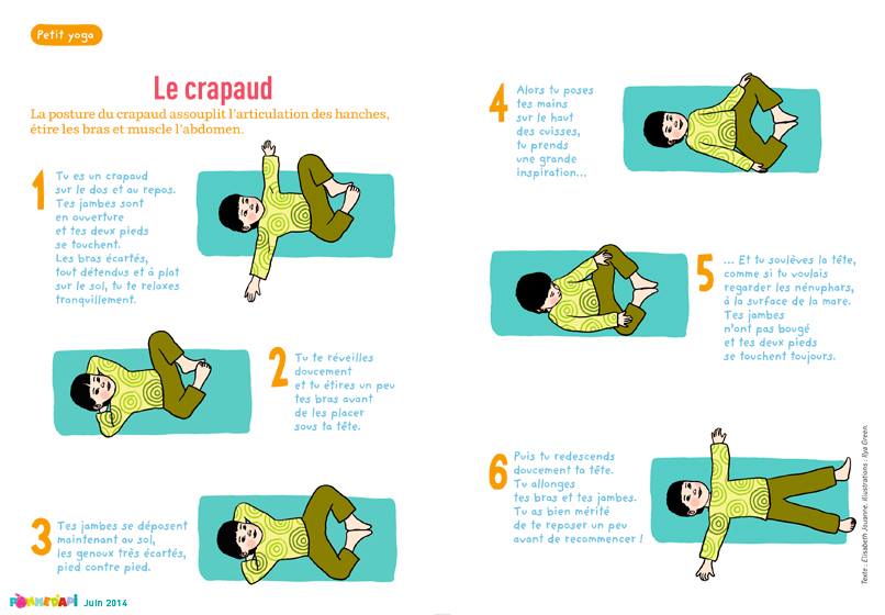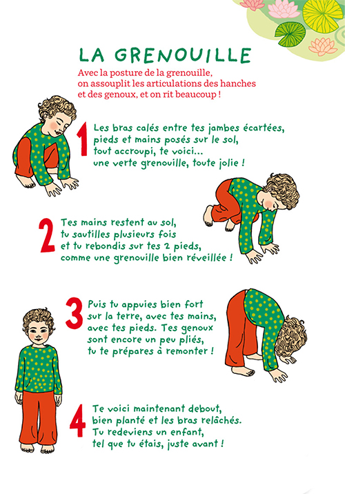 La grenouille : Avec la posture de la grenouille, on assouplit les articulations des hanches et des genoux, et on rit beaucoup !