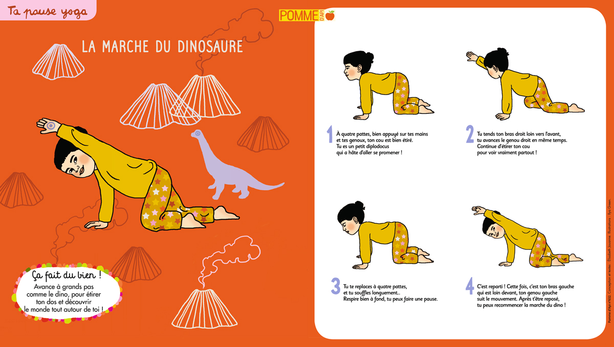 La marche du dinosaure:Avance à grans pas comme le dino, pour étirer ton dos et découvrir le monde tout autour de toi!