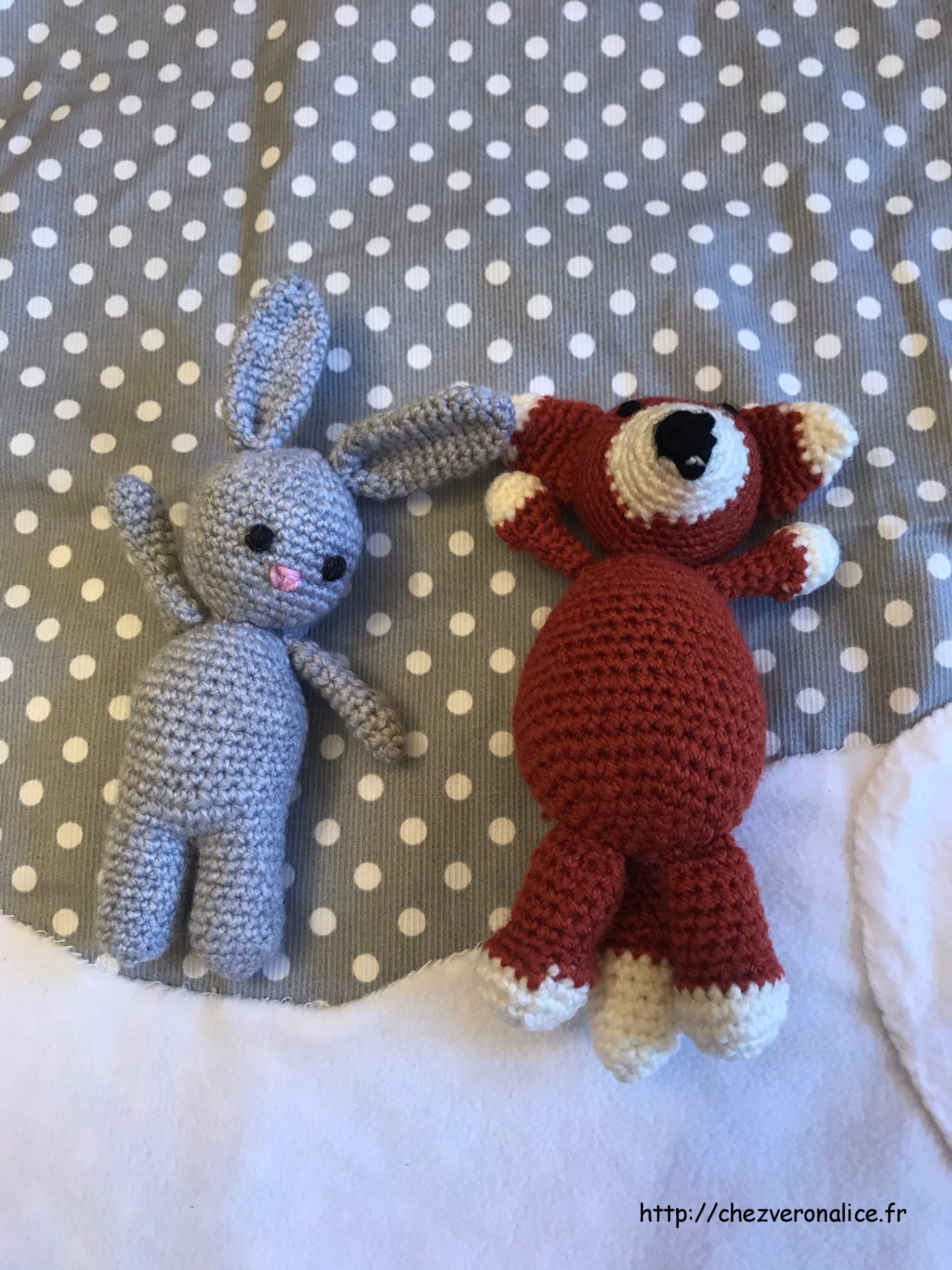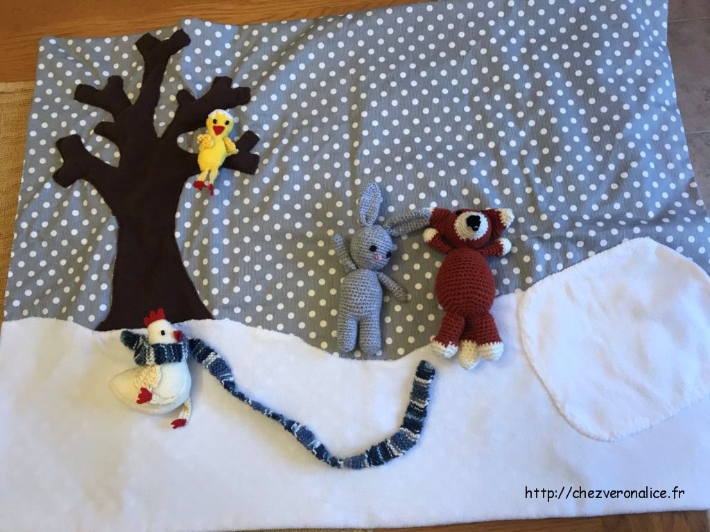 je vais partager le patron de la création de l’arbre, la poule, et le poussin. Le lapin et le renard sont à moitié de ma création, ou plutôt celle de ma Soeur Chantal qui a voulu participer, « merci ma Soeur ». Elle a pris la tête sur un tuto et le corp un peu à sa façon. tuto que vous trouverez facilement sur youtube.