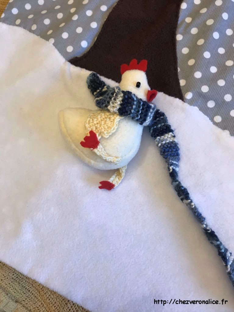 L’écharpe je l’ai faites en tricot aux aiguilles, mais vous pouvez la faire aussi en tissus.