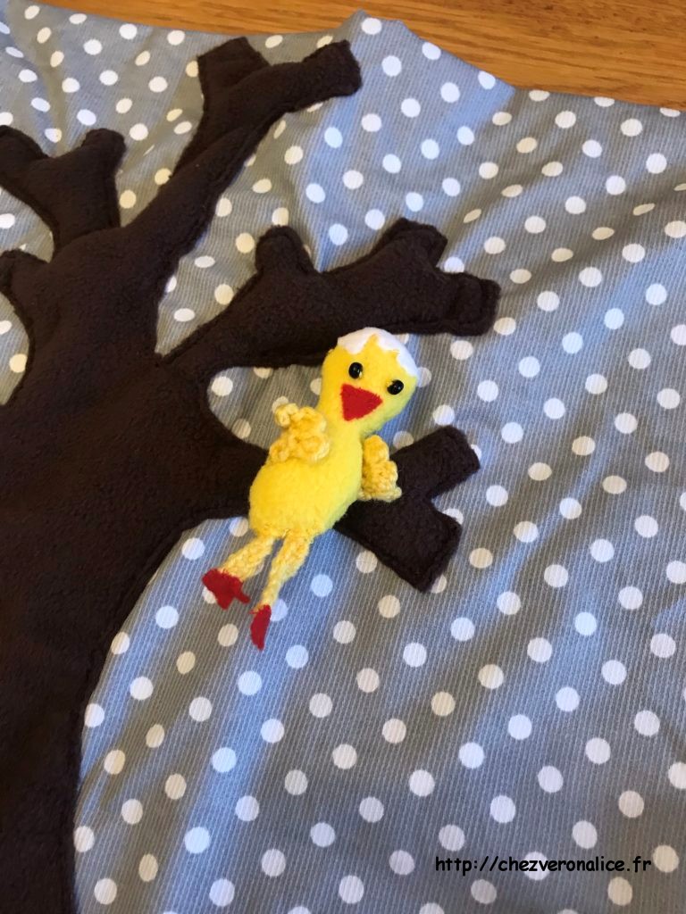 Pour les tissus, j’ai choisi de la polaire pour faire mon arbre, ma poule et mon poussin. J’utilise du fil à crocheter pour faire les ailes de la poule et celles du poussin. Pour les becs j’ai pris de la feutrine rouge. Les yeux j’ai utilisé des perles noires.