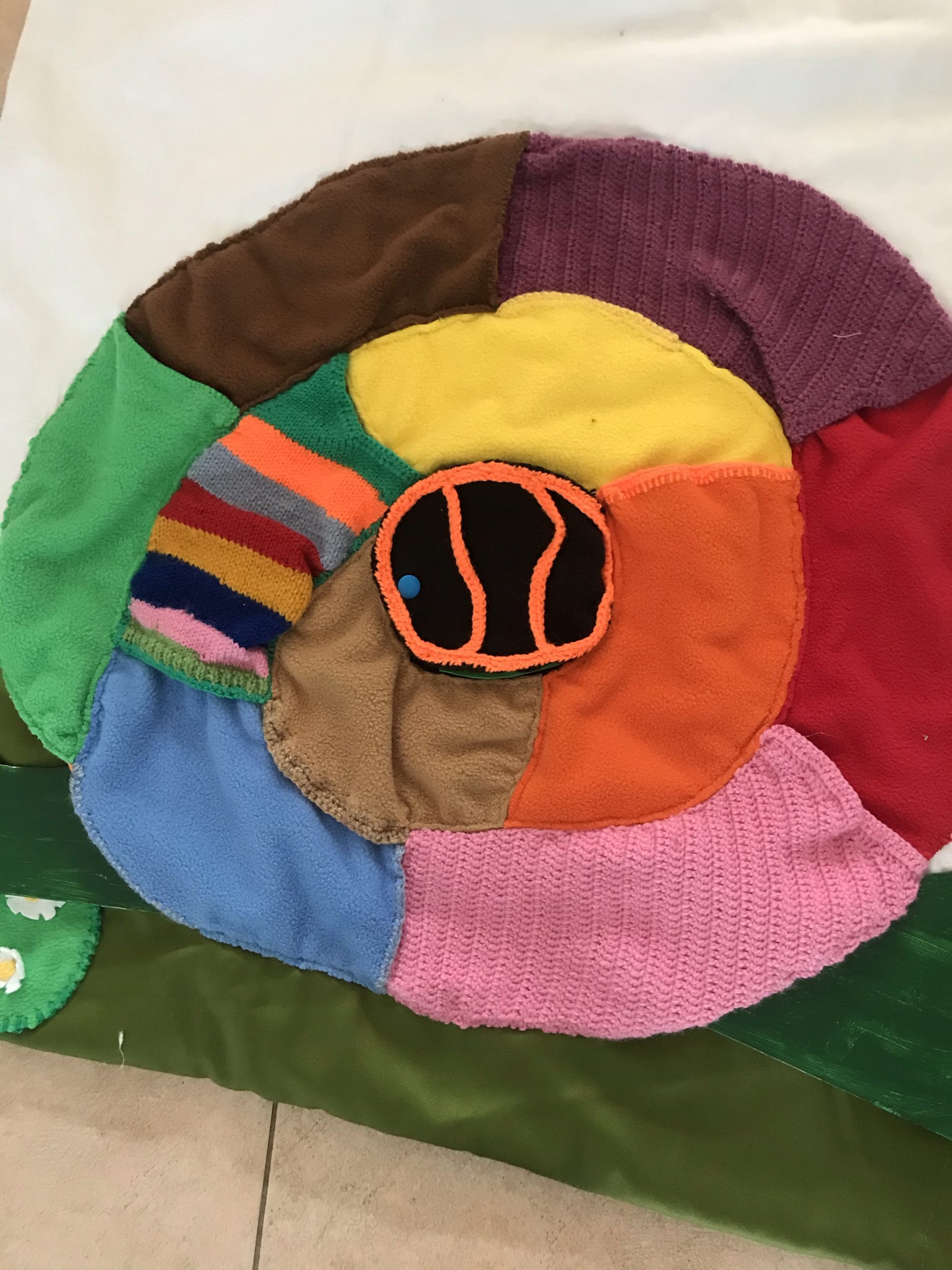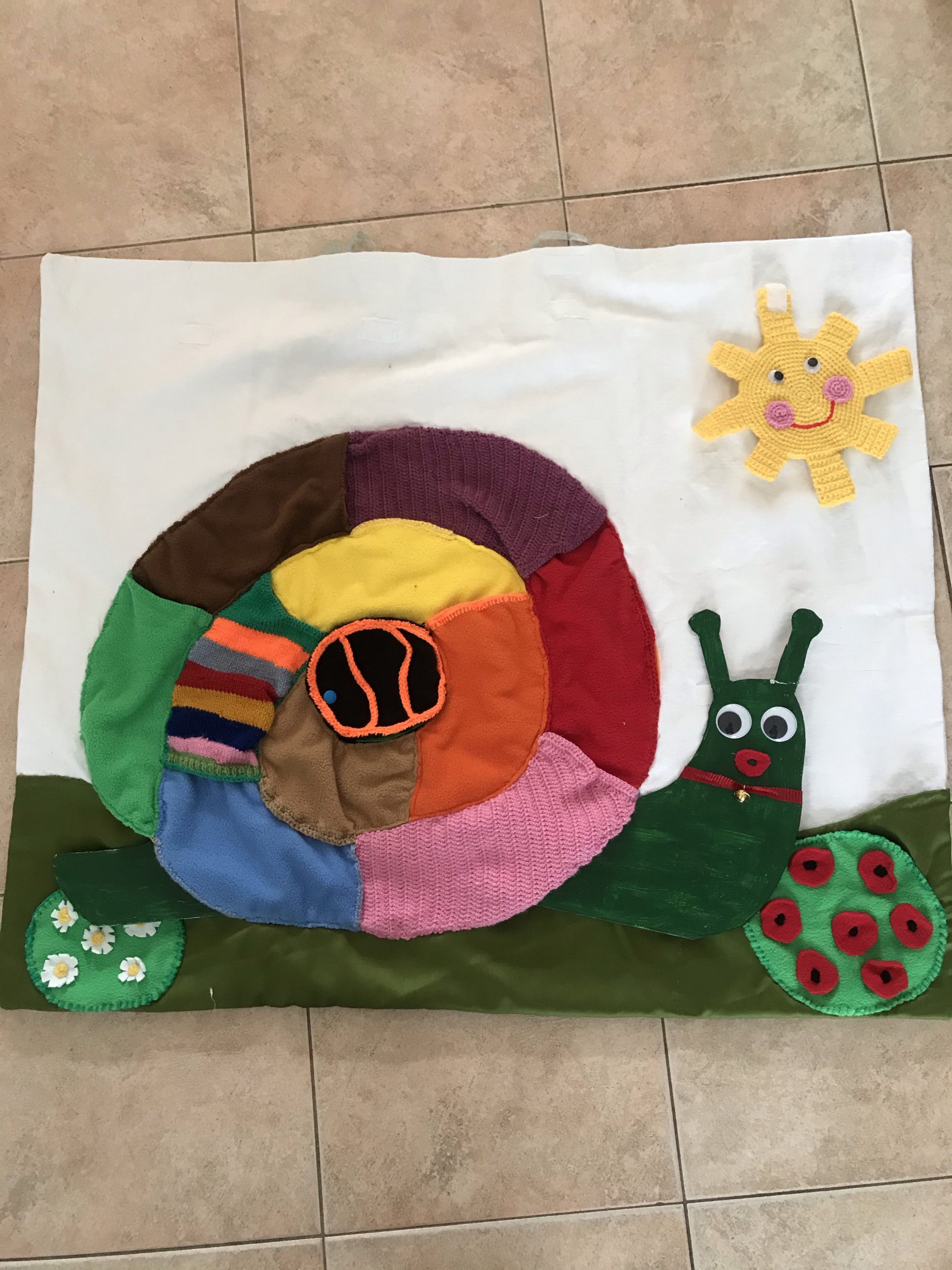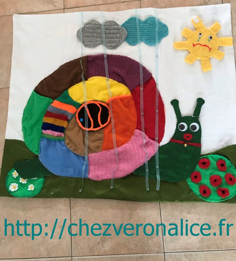 Je viens de réaliser ce nouveau tapis à histoire que j’ai appelé « escargot rigolo » car il est ludique et amusant pour les enfants. Inspiré d’un escargot vu sur mon groupe FB, mais j’ai modifié le concept et me le suis approprié différemment.