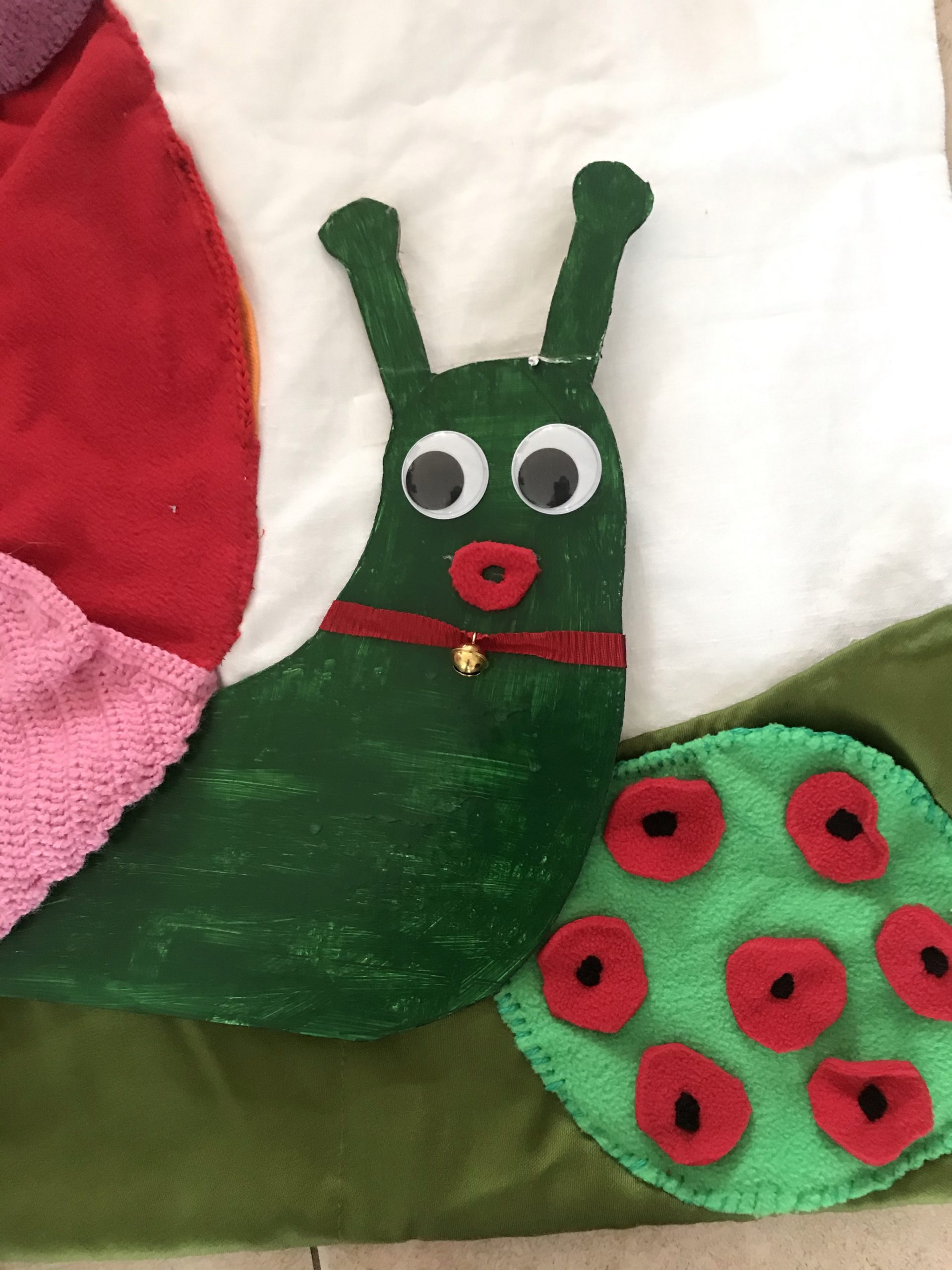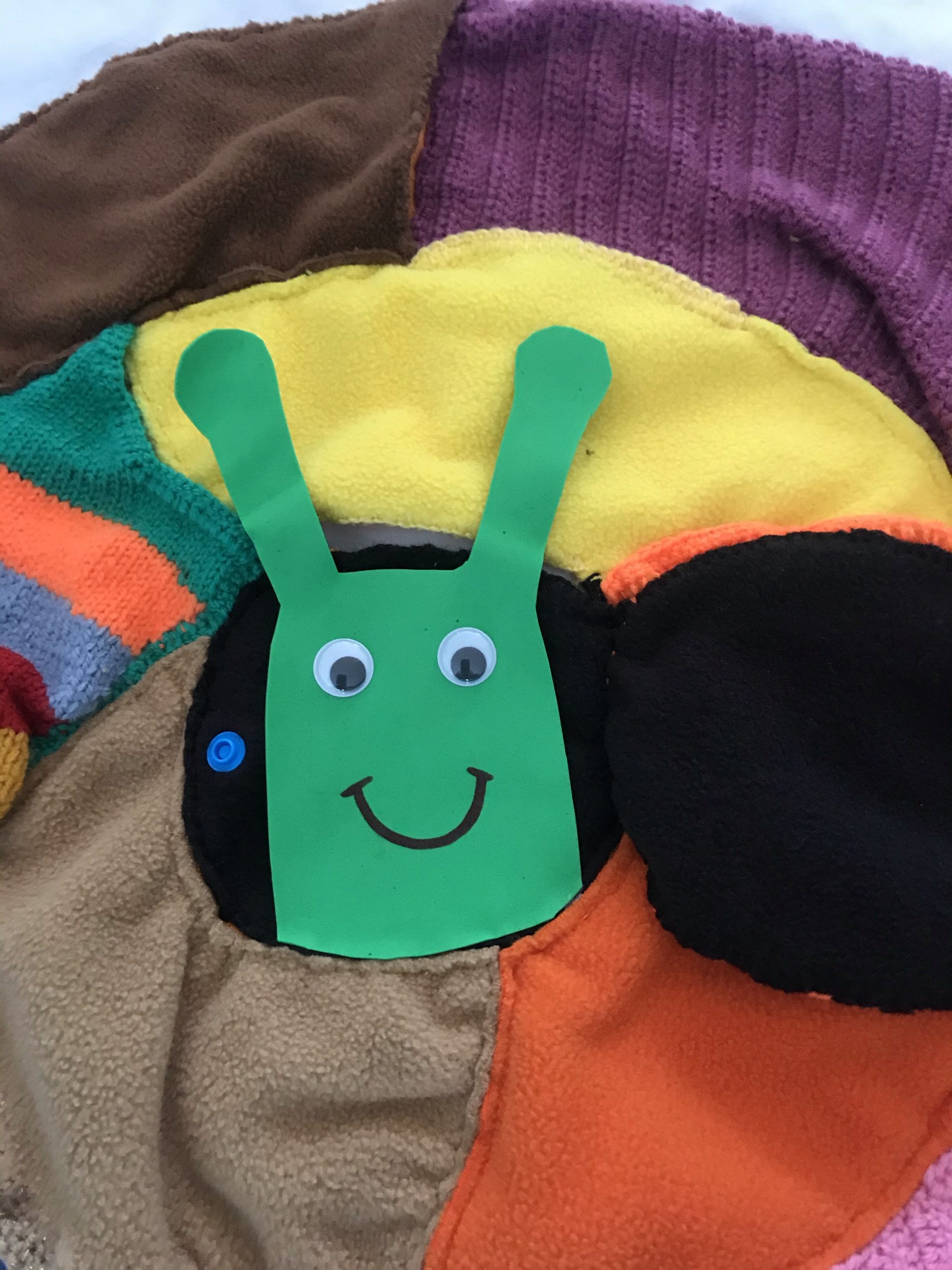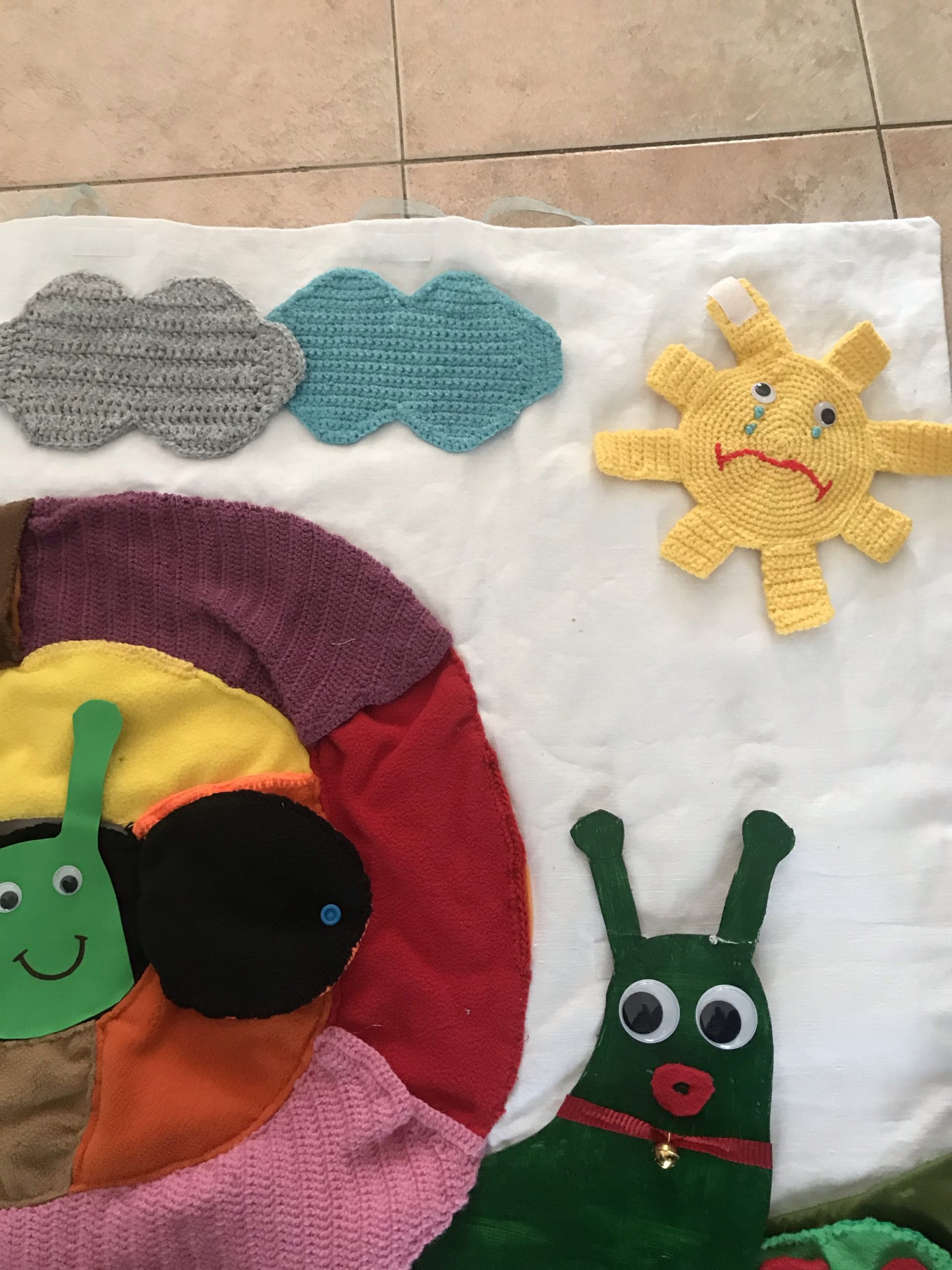 Je viens de réaliser ce nouveau tapis à histoire que j’ai appelé « escargot rigolo » car il est ludique et amusant pour les enfants. Inspiré d’un escargot vu sur mon groupe FB, mais j’ai modifié le concept et me le suis approprié différemment.