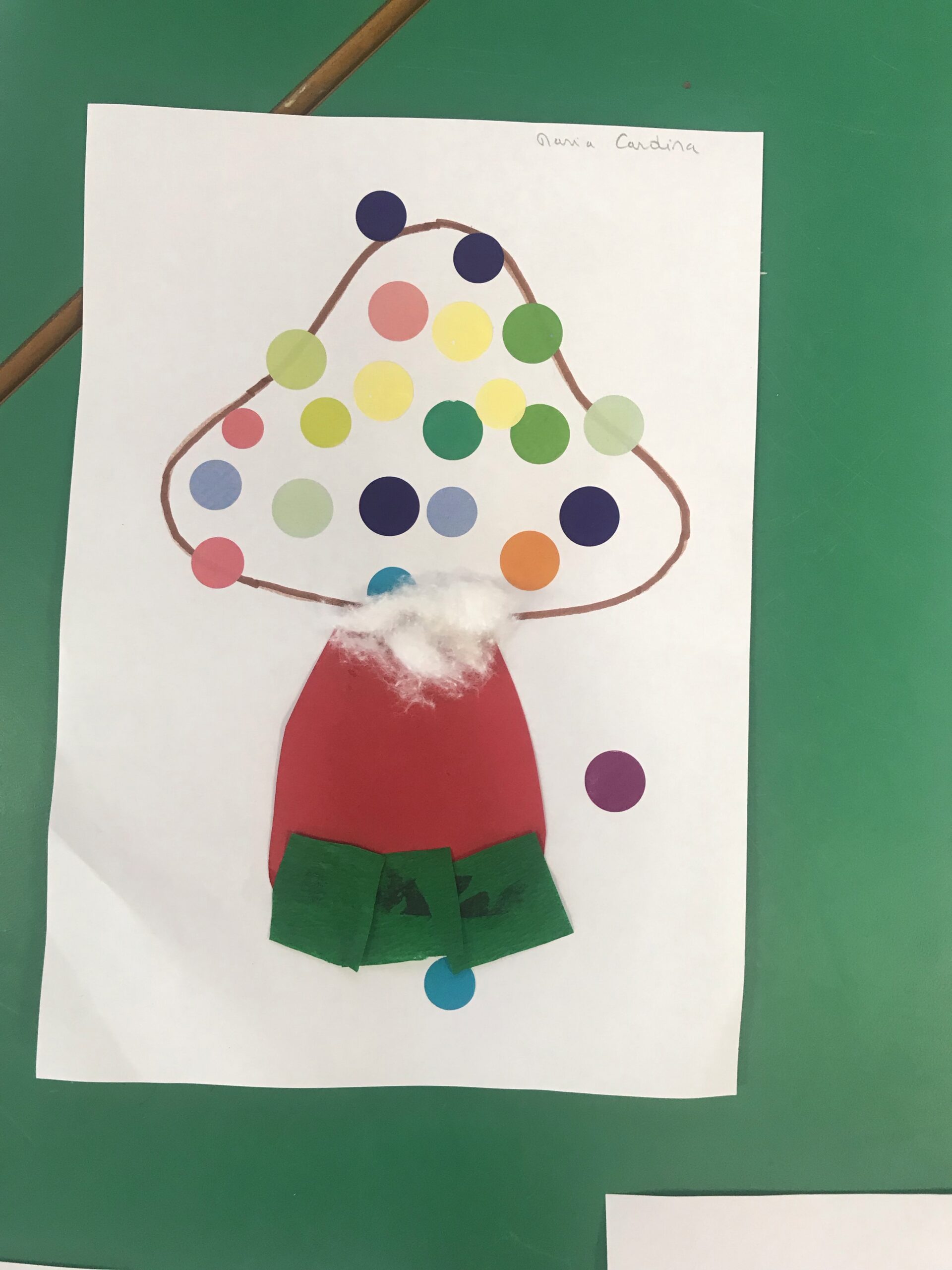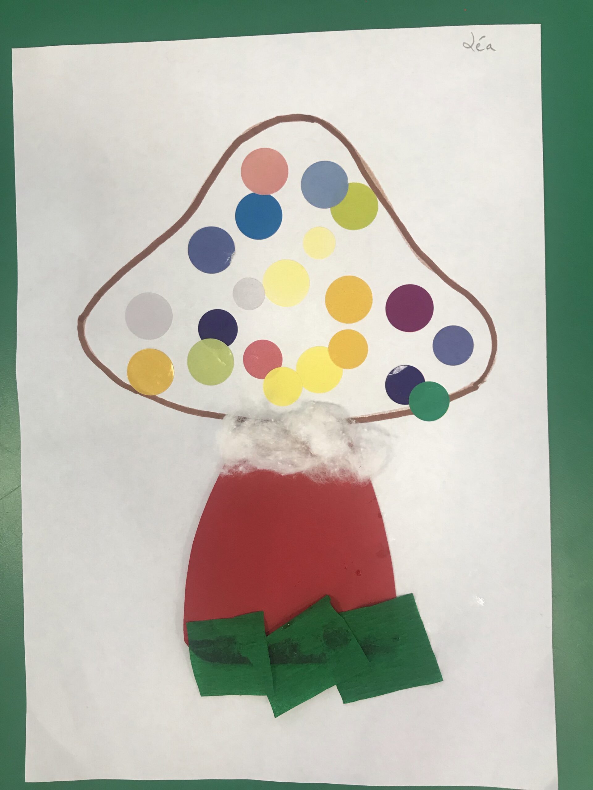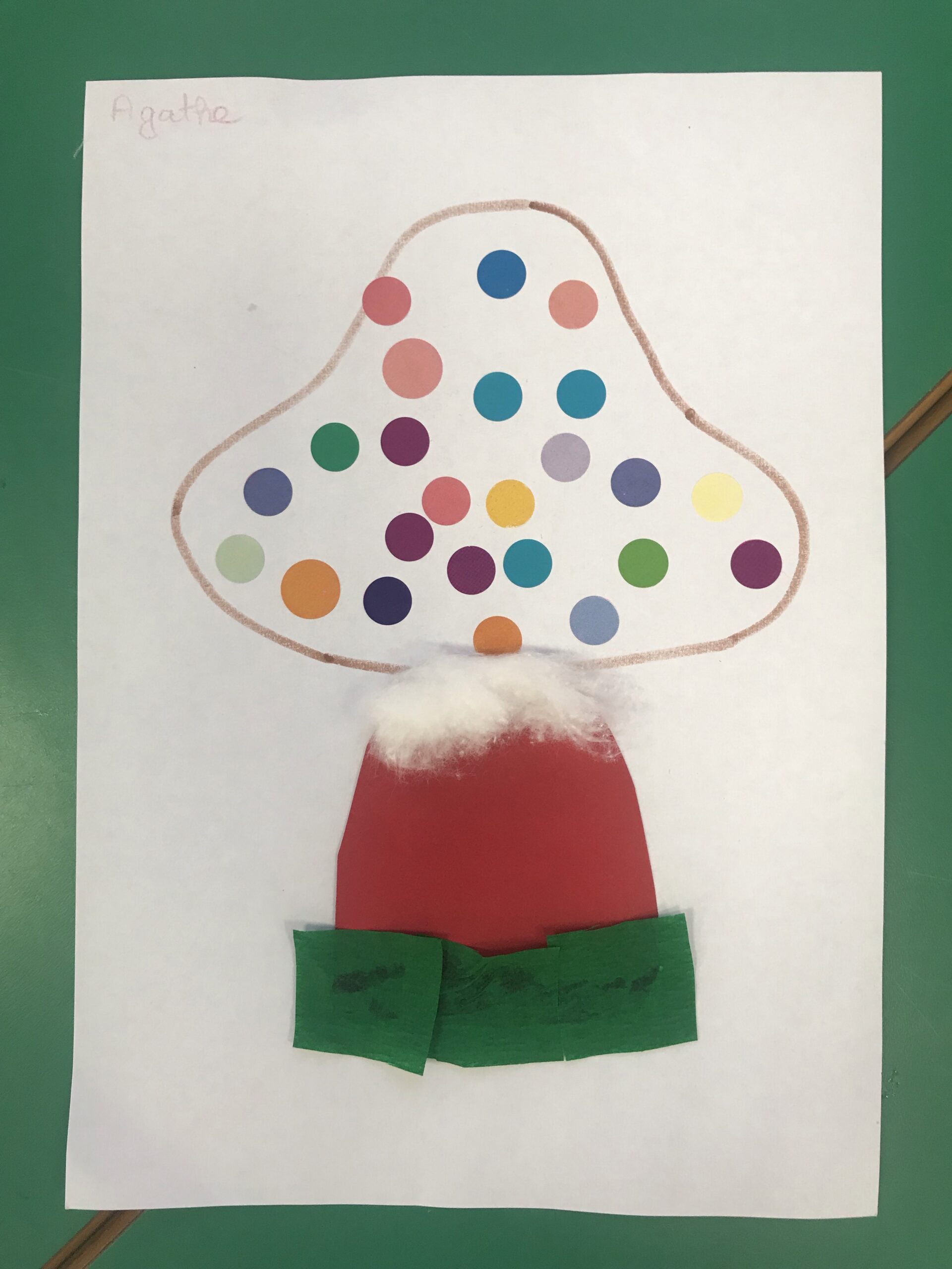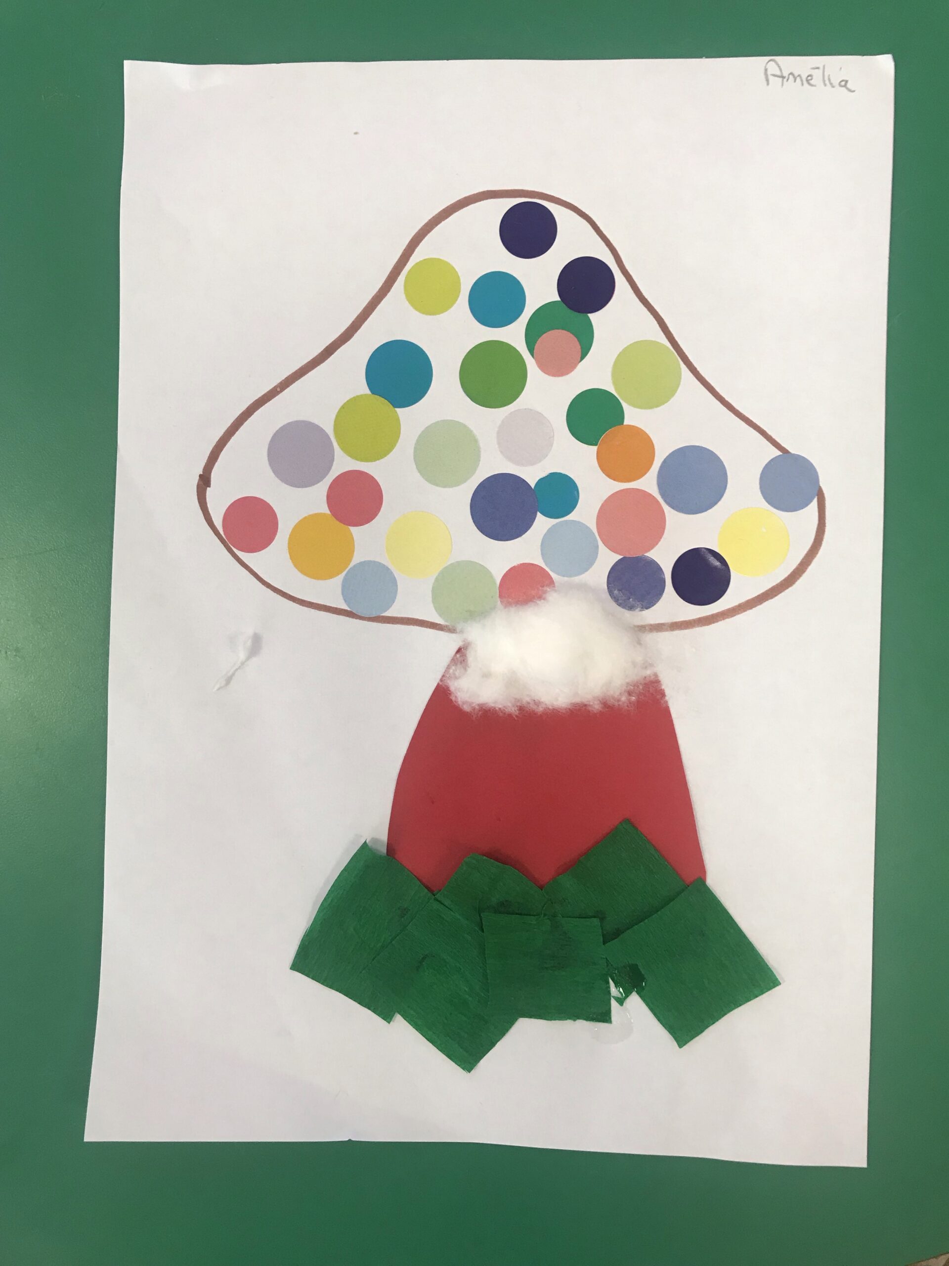 Un champignon gommettes, avec différent matériaux pour la finition. Vous aurez plus bas les réalisations de nos poussins dans les regroupements