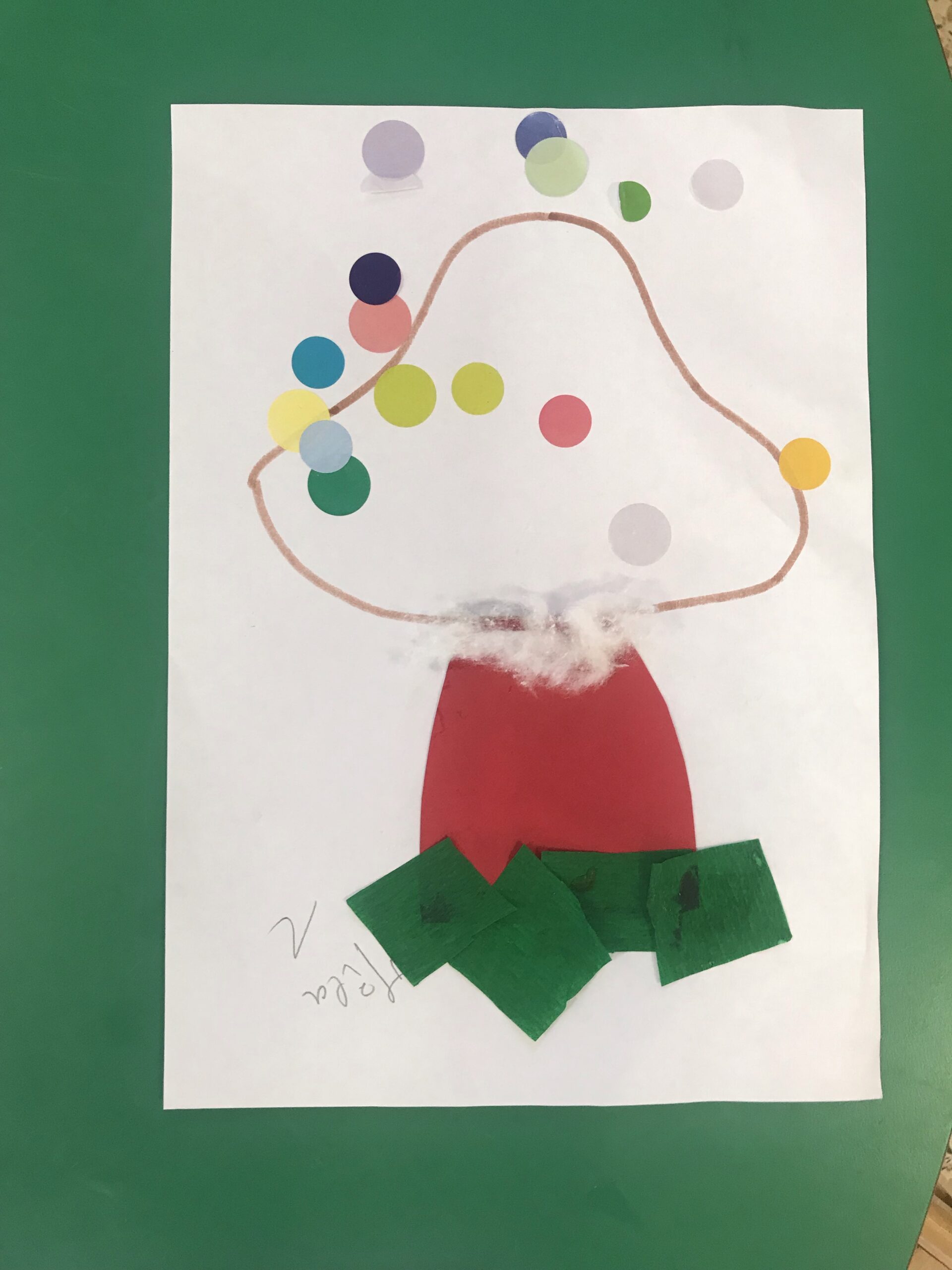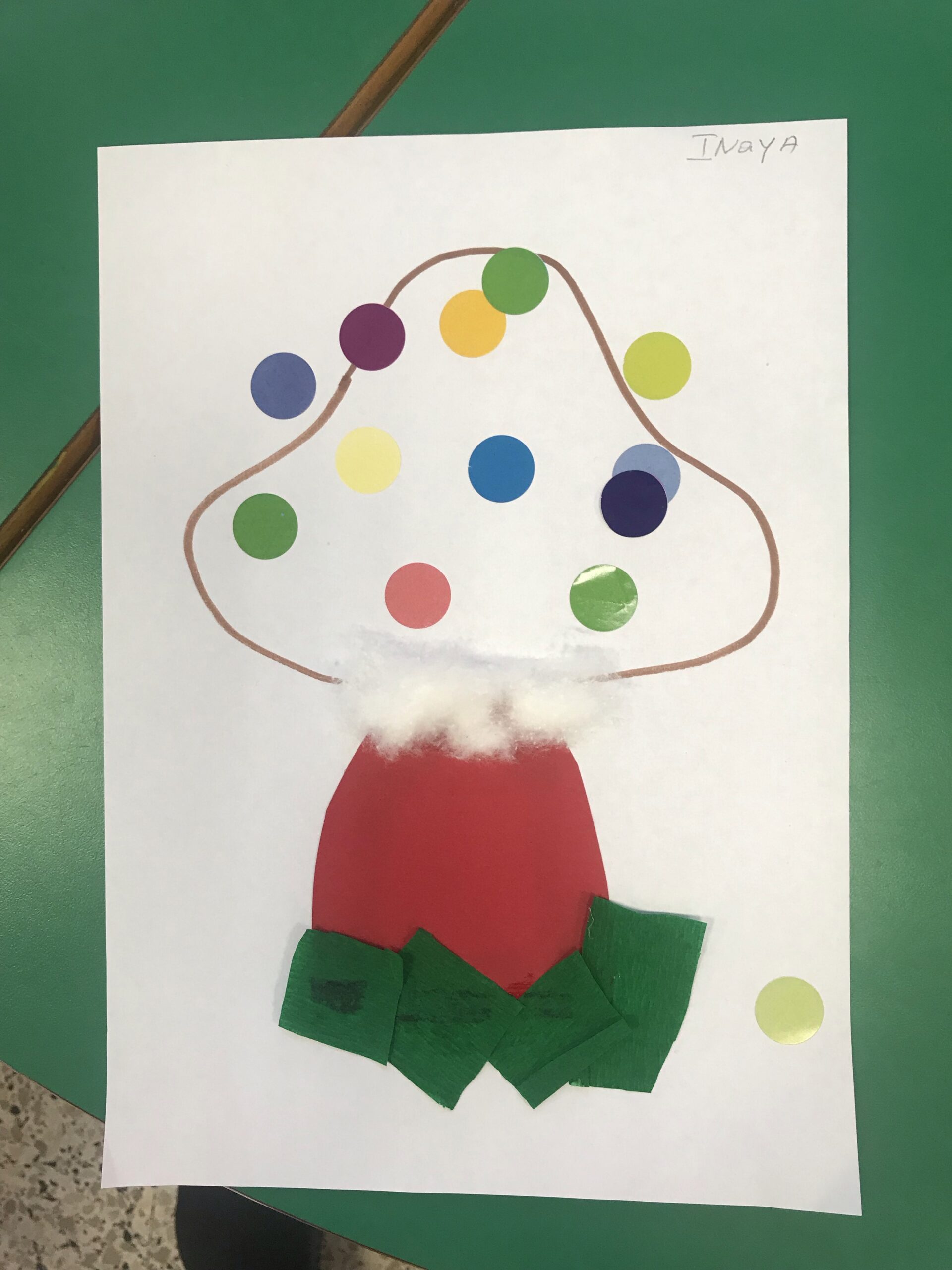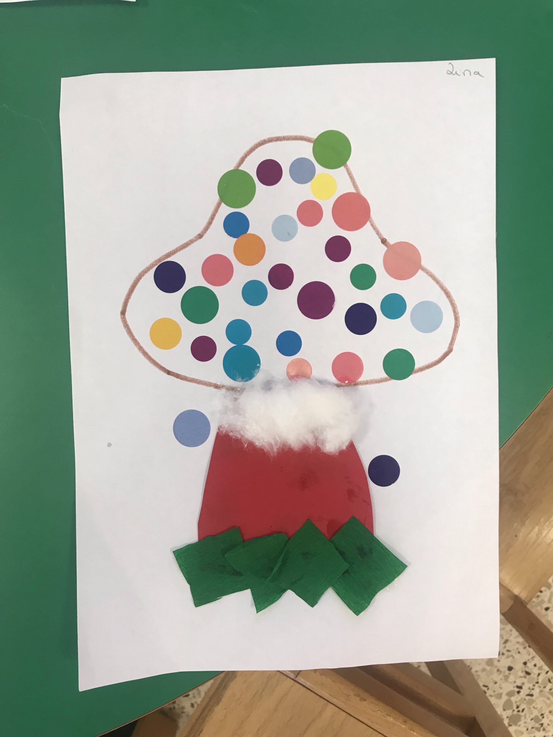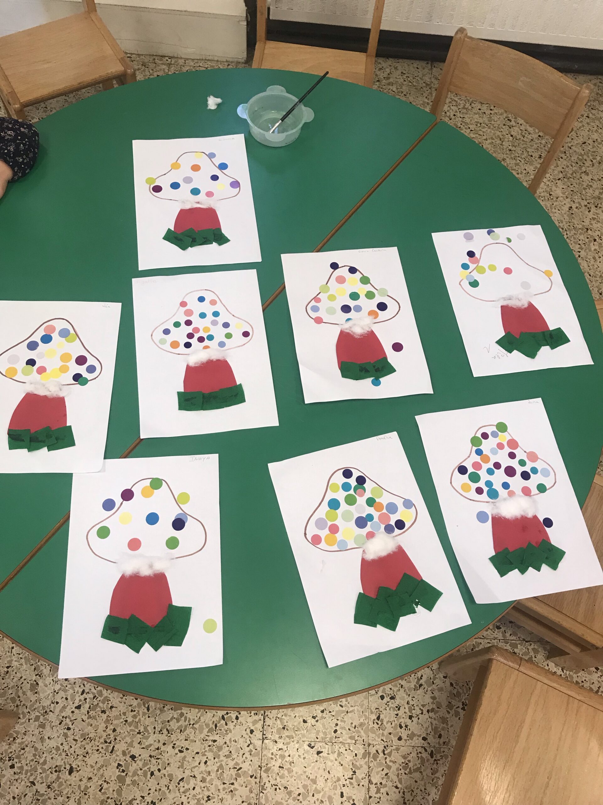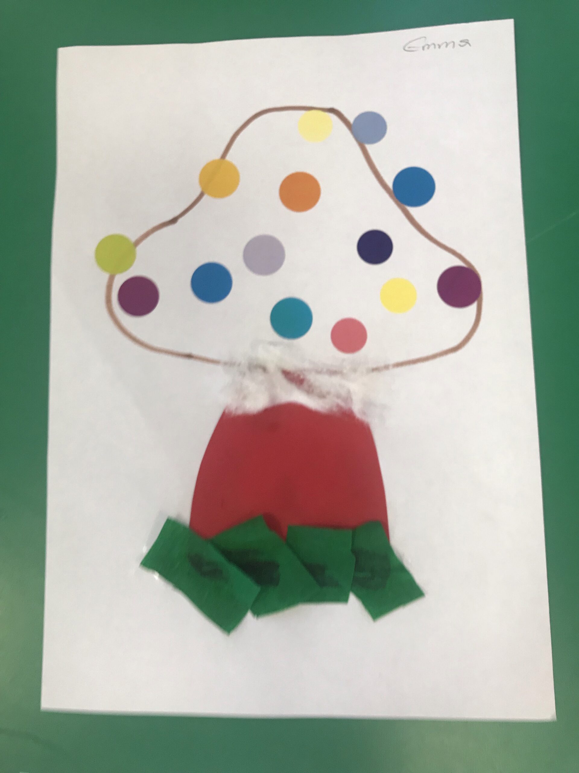 Un champignon gommettes, avec différent matériaux pour la finition. Vous aurez plus bas les réalisations de nos poussins dans les regroupements