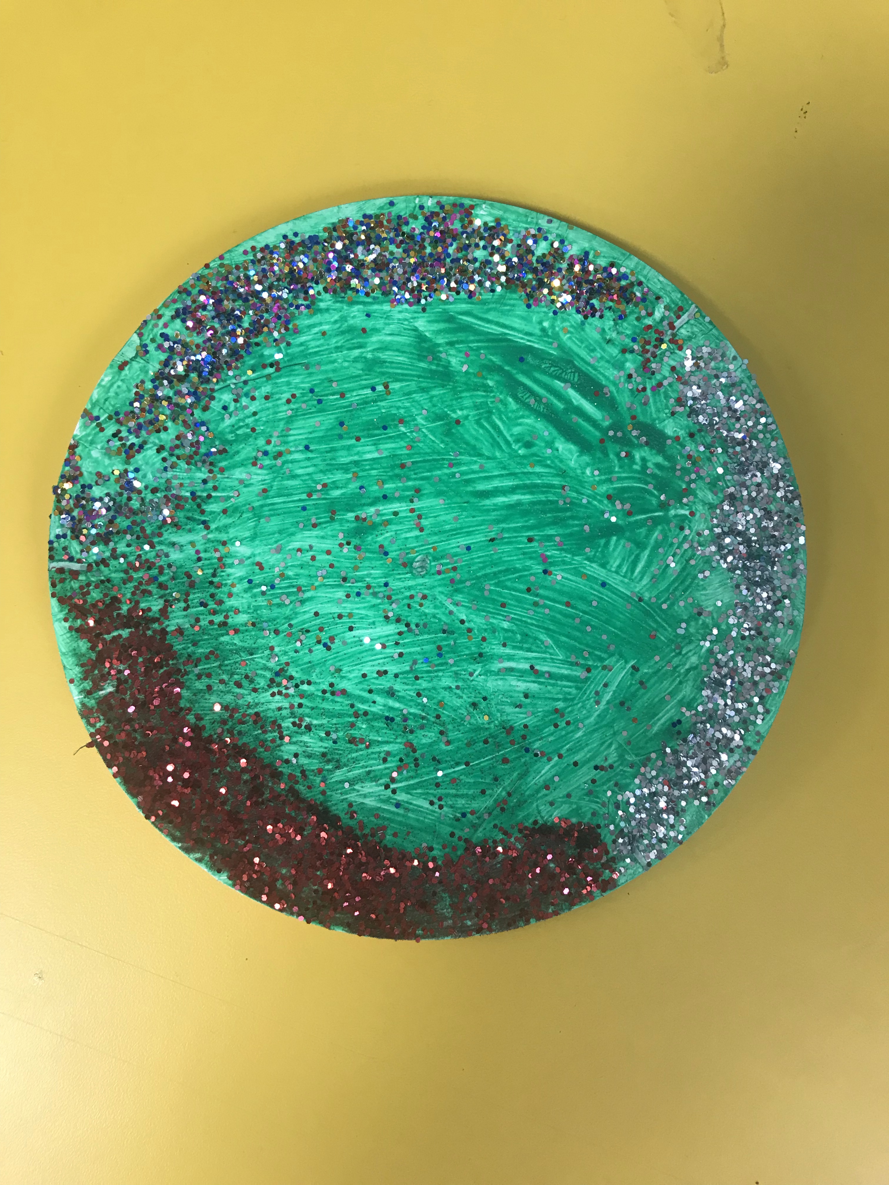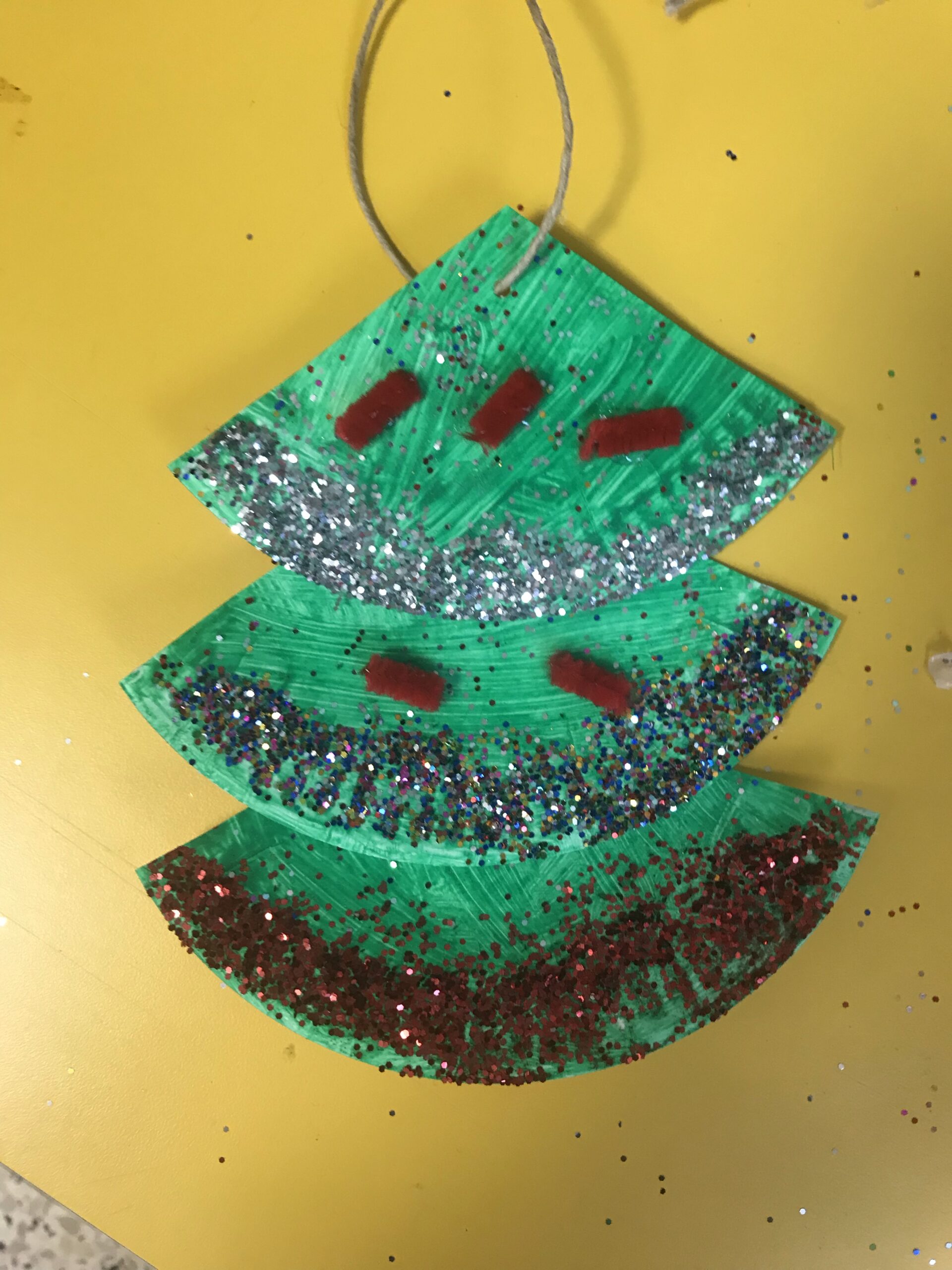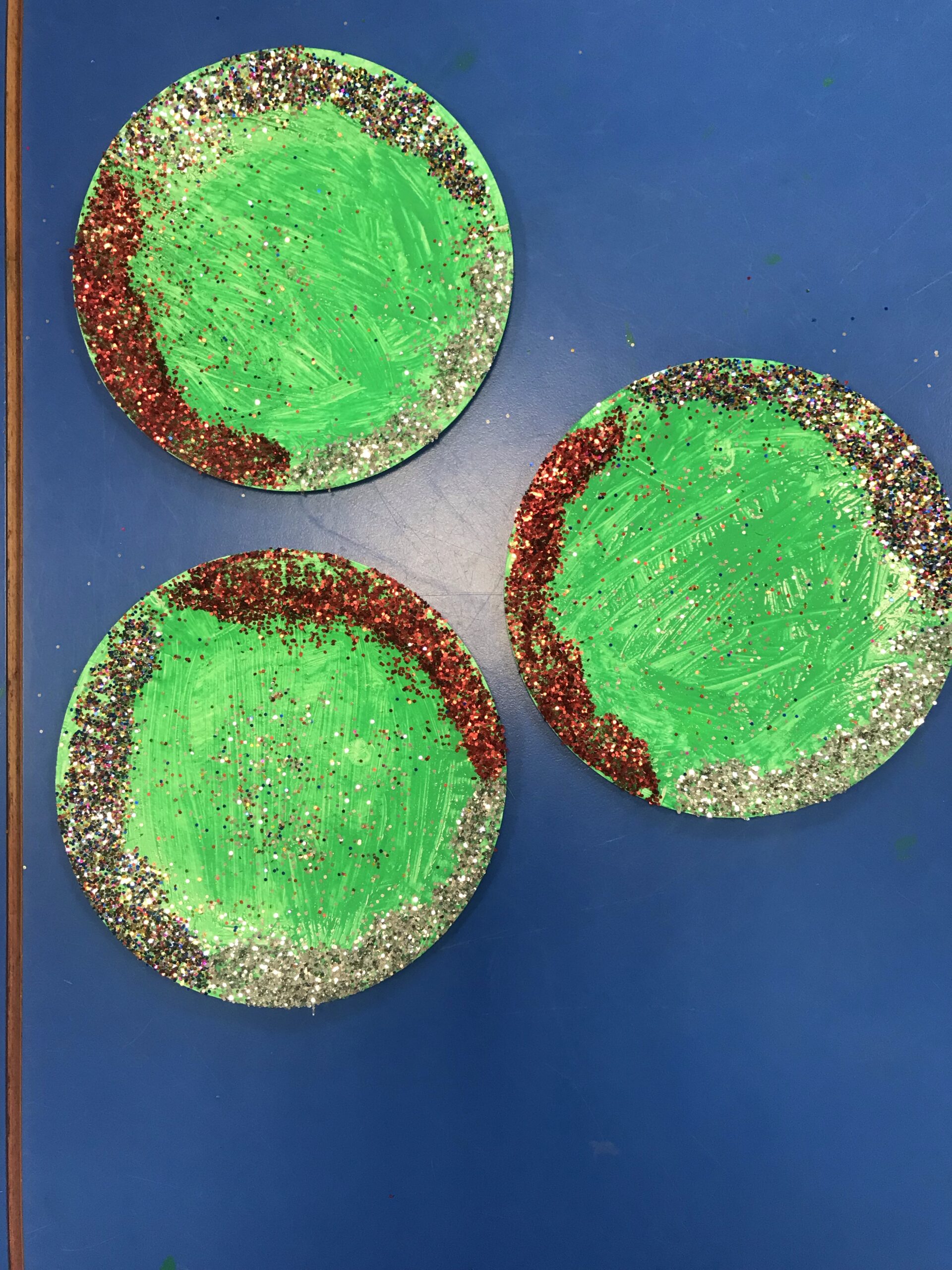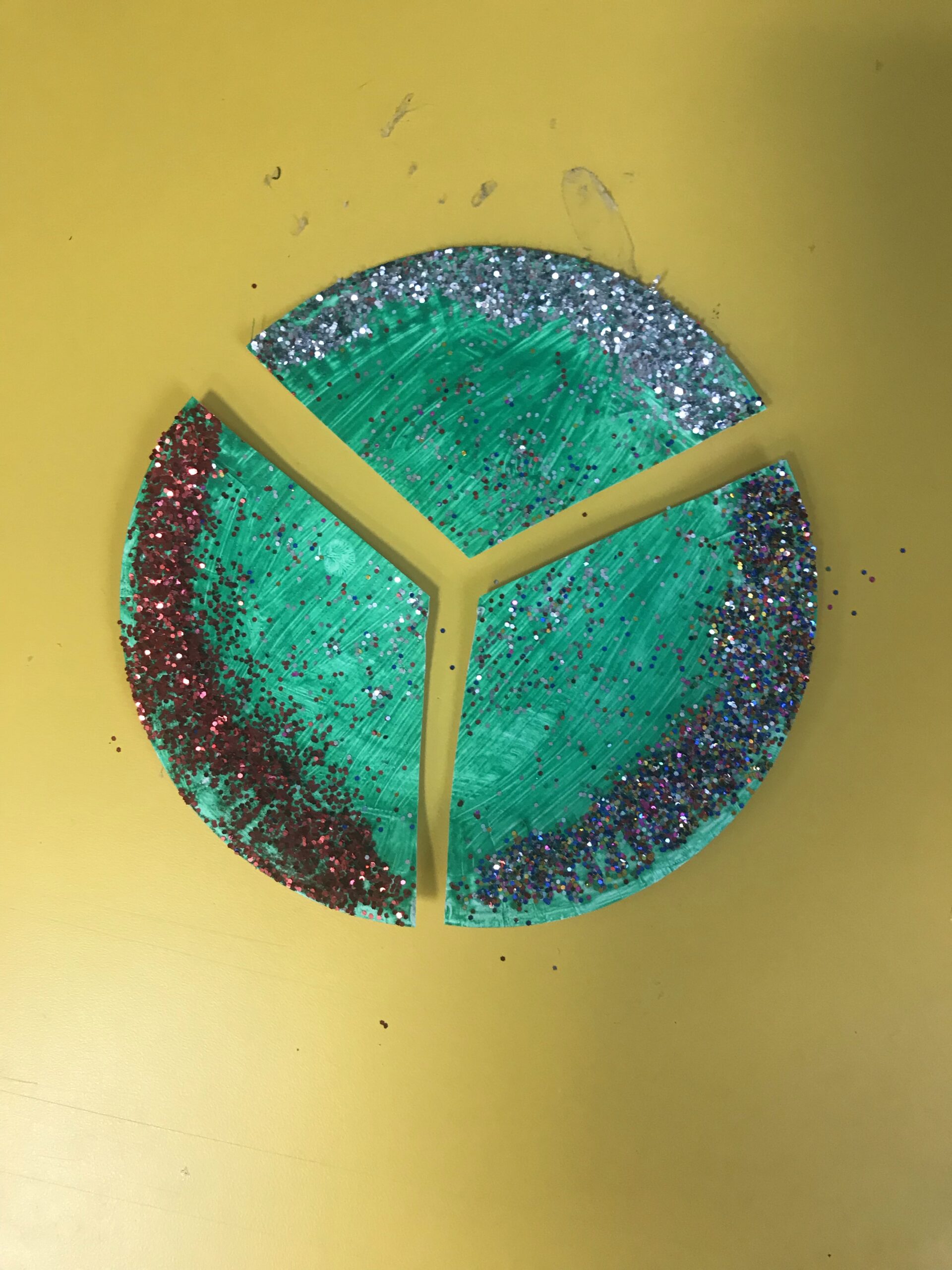 Peindre en premier l’assiette en vert et y mettre avant qu’elle sèche les paillettes tout autour du bord de celle-ci. Nous avons fait le choix de mettre 3 couleurs différentes de paillettes en tenant compte d’une bonne distance de découpe de nos trois morceaux de sapin. Vous devrez ensuite la couper en 3 triangles. J’en ai découpé 2 presque à l’identique et le troisième plus petit qui sera celui du haut.