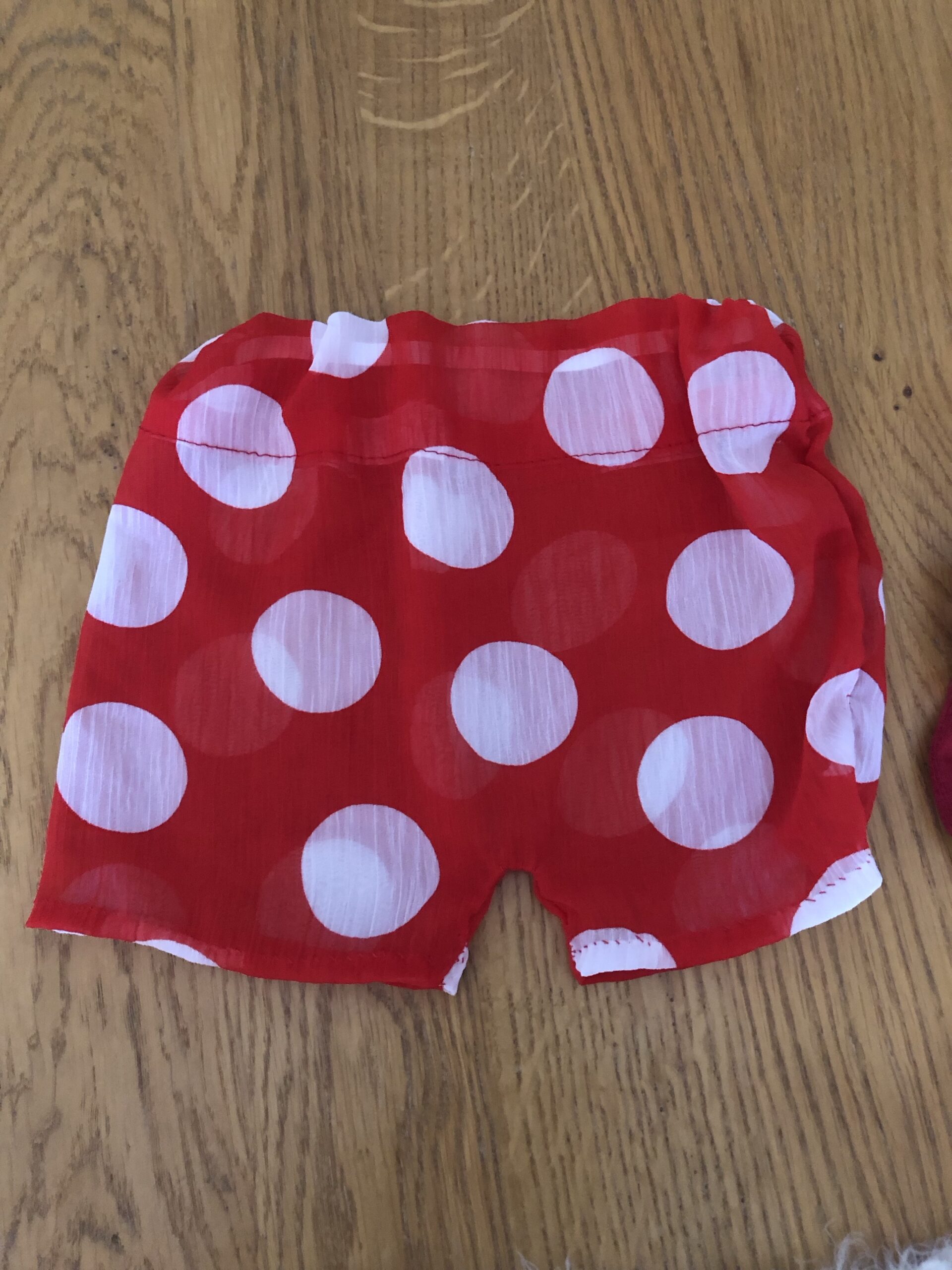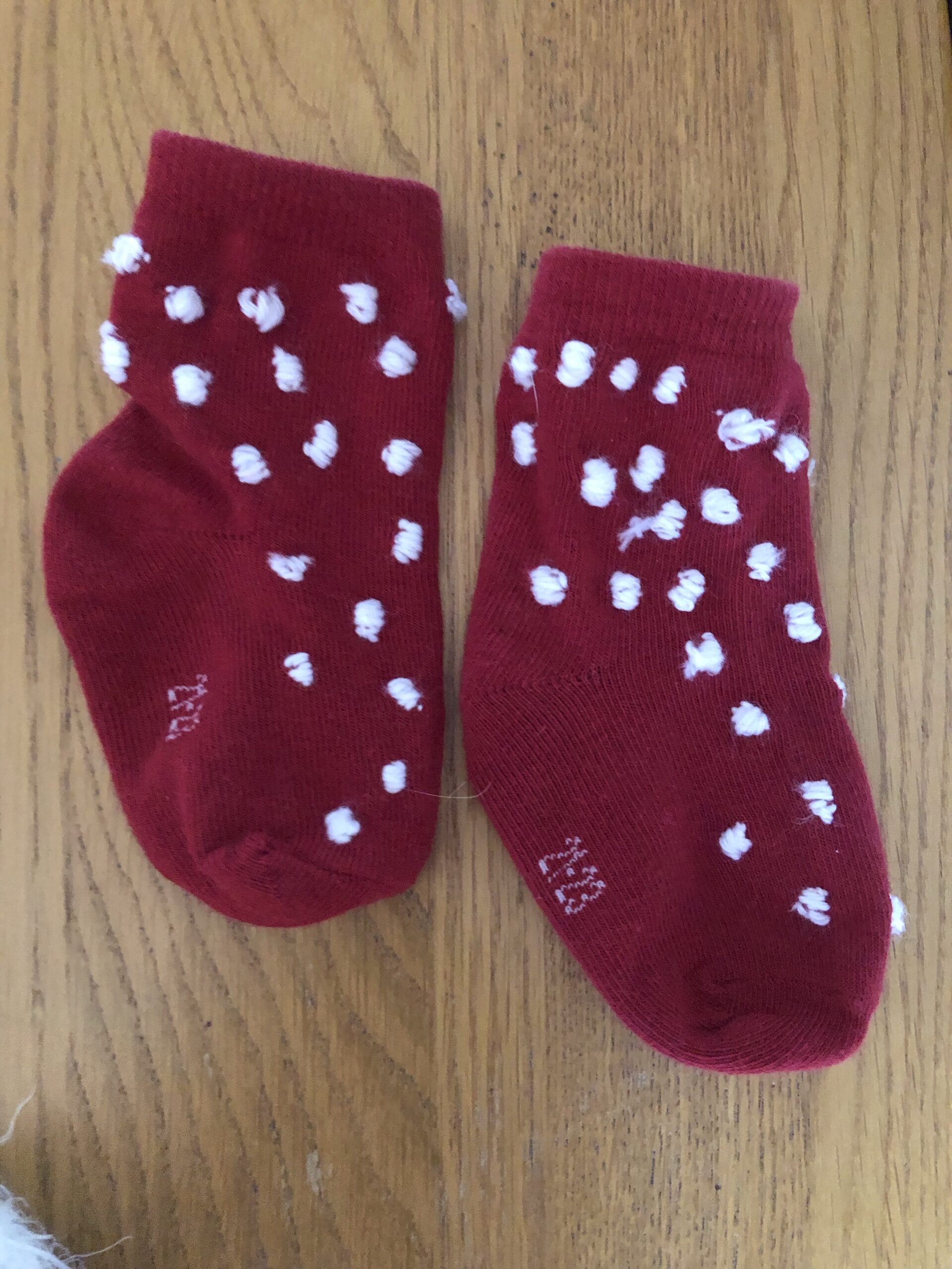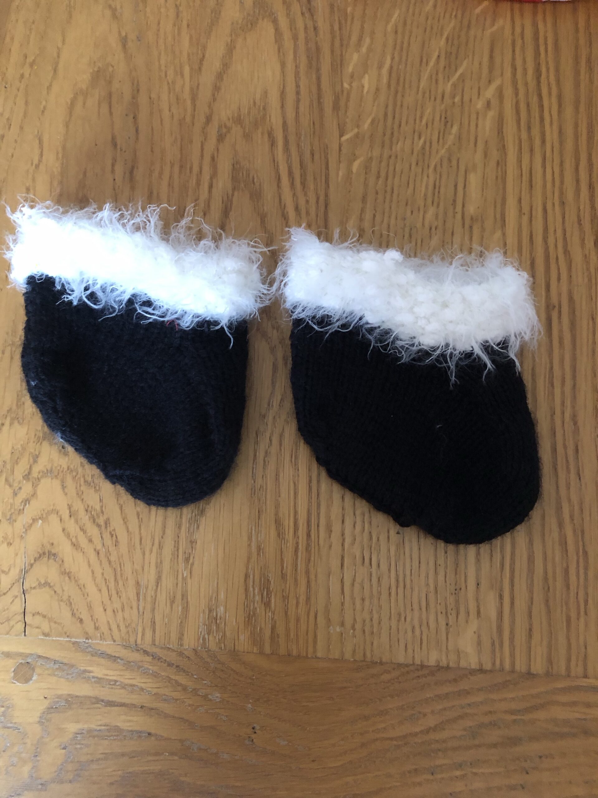 Ensuite je lui ai fabriqué le caleçon, les chaussettes rouge ou j’ai brodé des pois blanc, les bottes qui ont été faites au tricots pour le père Noël trouvé dans un vide grenier.