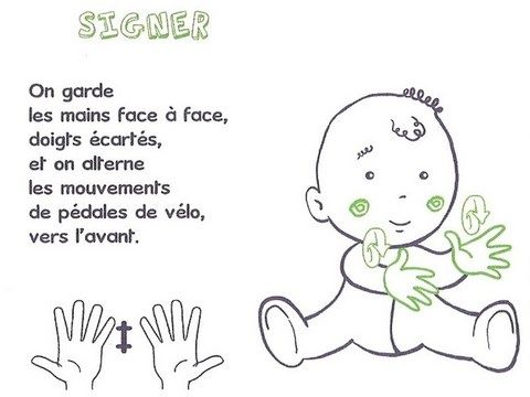 - Les signes de la vie quotidienne : Bonjour – Au revoir – Bisou – Oui – Non – Où ? – Merci – Encore – Content – S’il te plaît – Pardon – Quoi ? – Qui ? – Pourquoi ? – Quand ?
