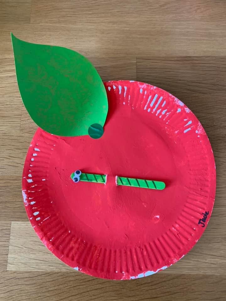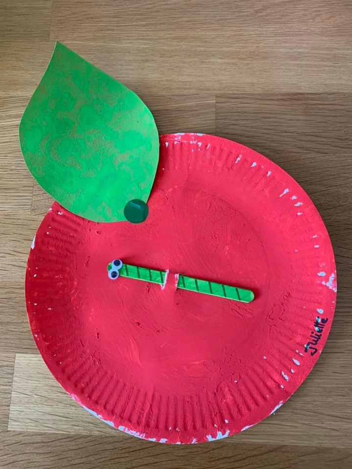 La pomme et son ver réaliser avec une assiette en carton et un bâton de glace.