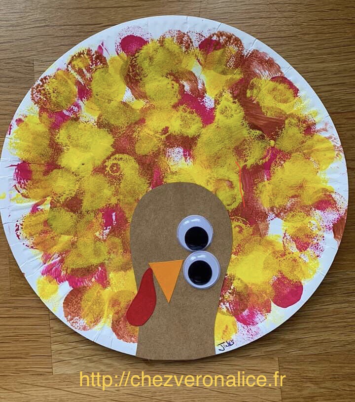 Peindre l’assiette avec le bouchon et trois couleurs, ensuite découper la tête du dindon du pdf et le coller