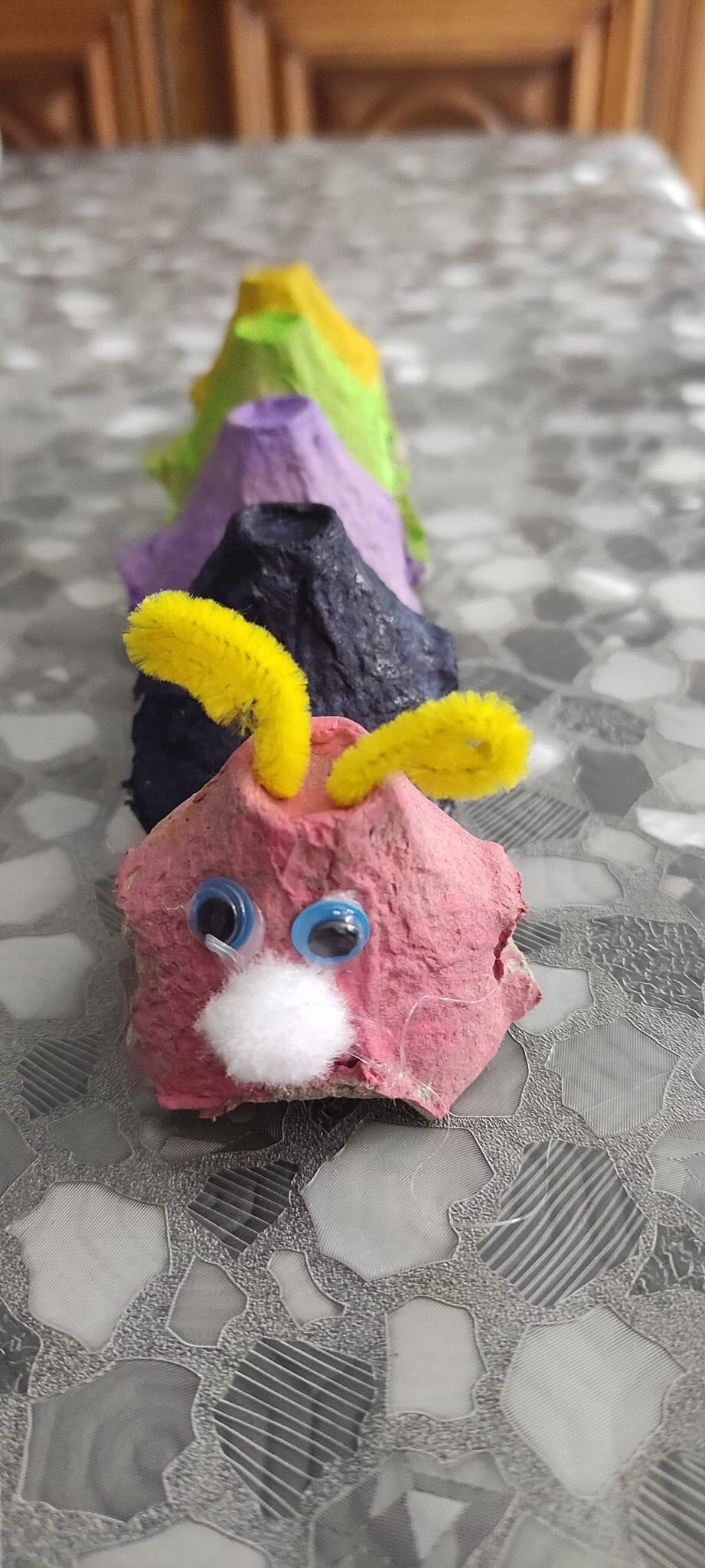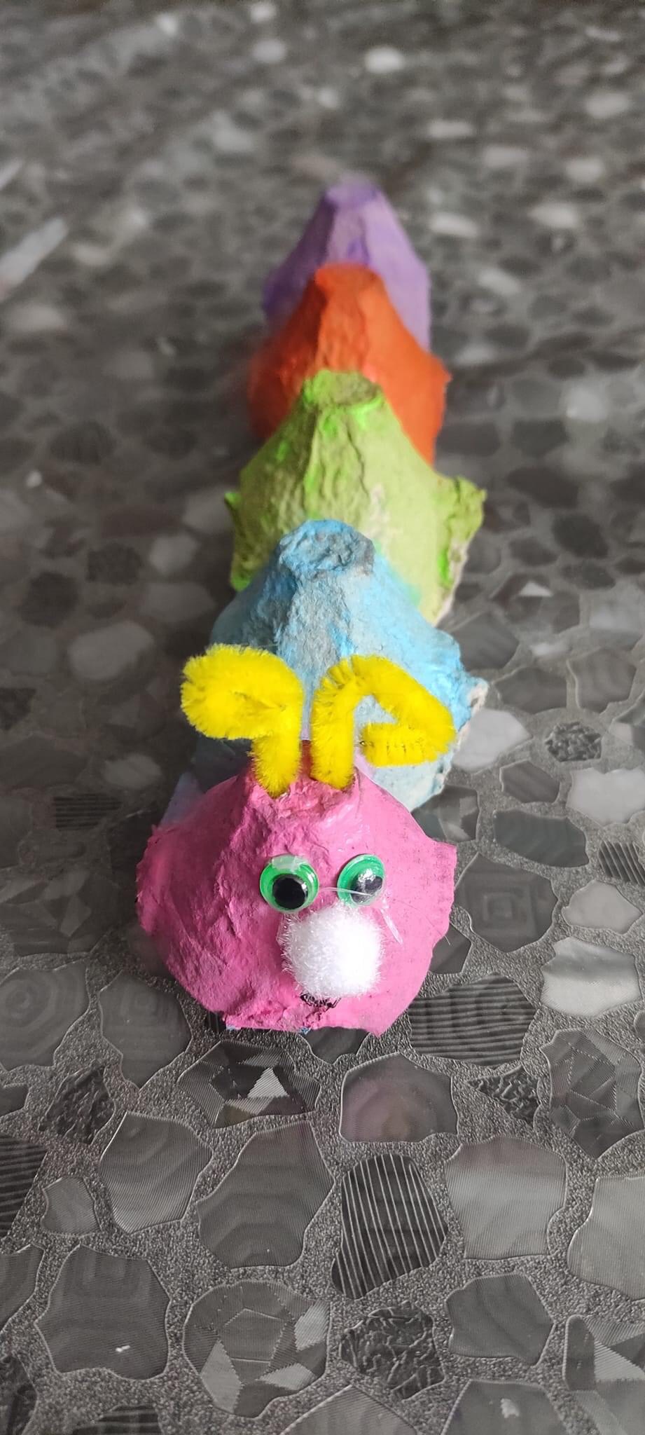 En premier il vous faudra découper la boite d’oeuf à la longueur voulu de la chenille. Faire peindre l’enfant avec différente couleur chaque alvéole. Une fois sec vous n’aurez plus qu’a finaliser avec le pistolet à colle pour y mettre les yeux sauf si vous en avez des collant, rajouter le nez. Ensuite vous n’aurez plus qu’a placer les antennes en faisant un petit trou avec une pointe et à les pousser dans le trou avec l’aide d’un cure dent ou autre pointe.
