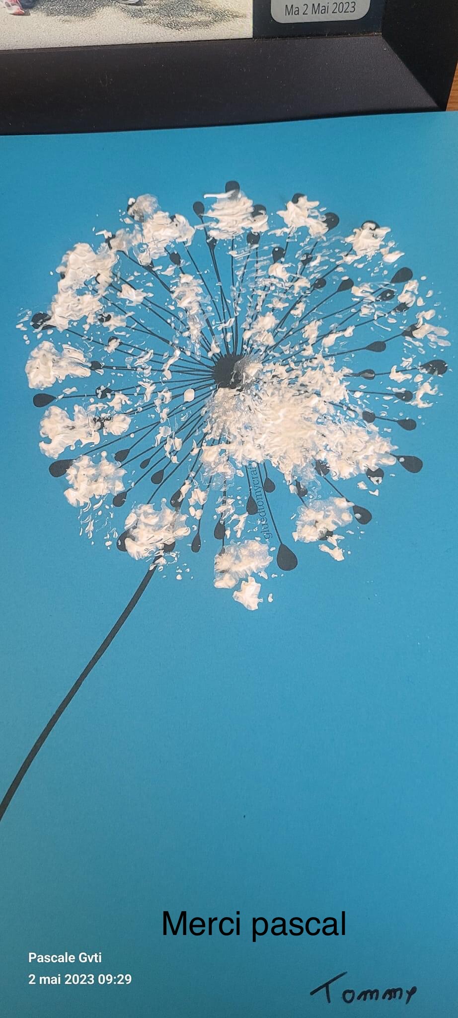 L’idée est d’imprimer le pissenlit que vous trouvera plus bas au format pdf, sur un papier de couleur un peu épais pour proposer de la peinture blanche pour reproduire l’effet pissenlit.